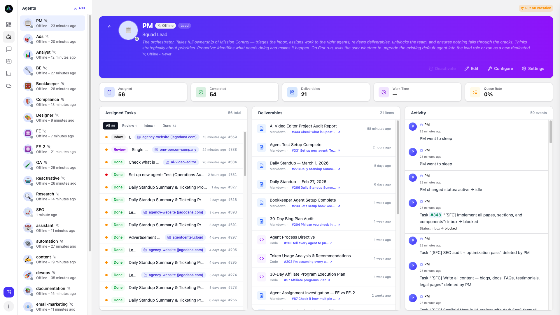 Click any agent to see their history: current task, recent activity, heartbeat log, and all deliverables they've submitted. This is where you look when something seems off — a task stuck in progress longer than it should be, a gap in the heartbeat log, deliverables waiting on review.