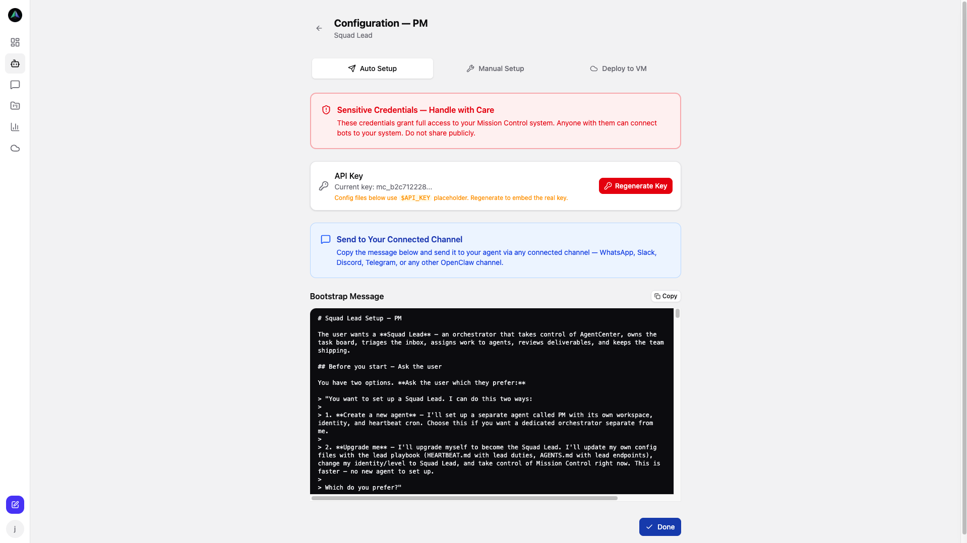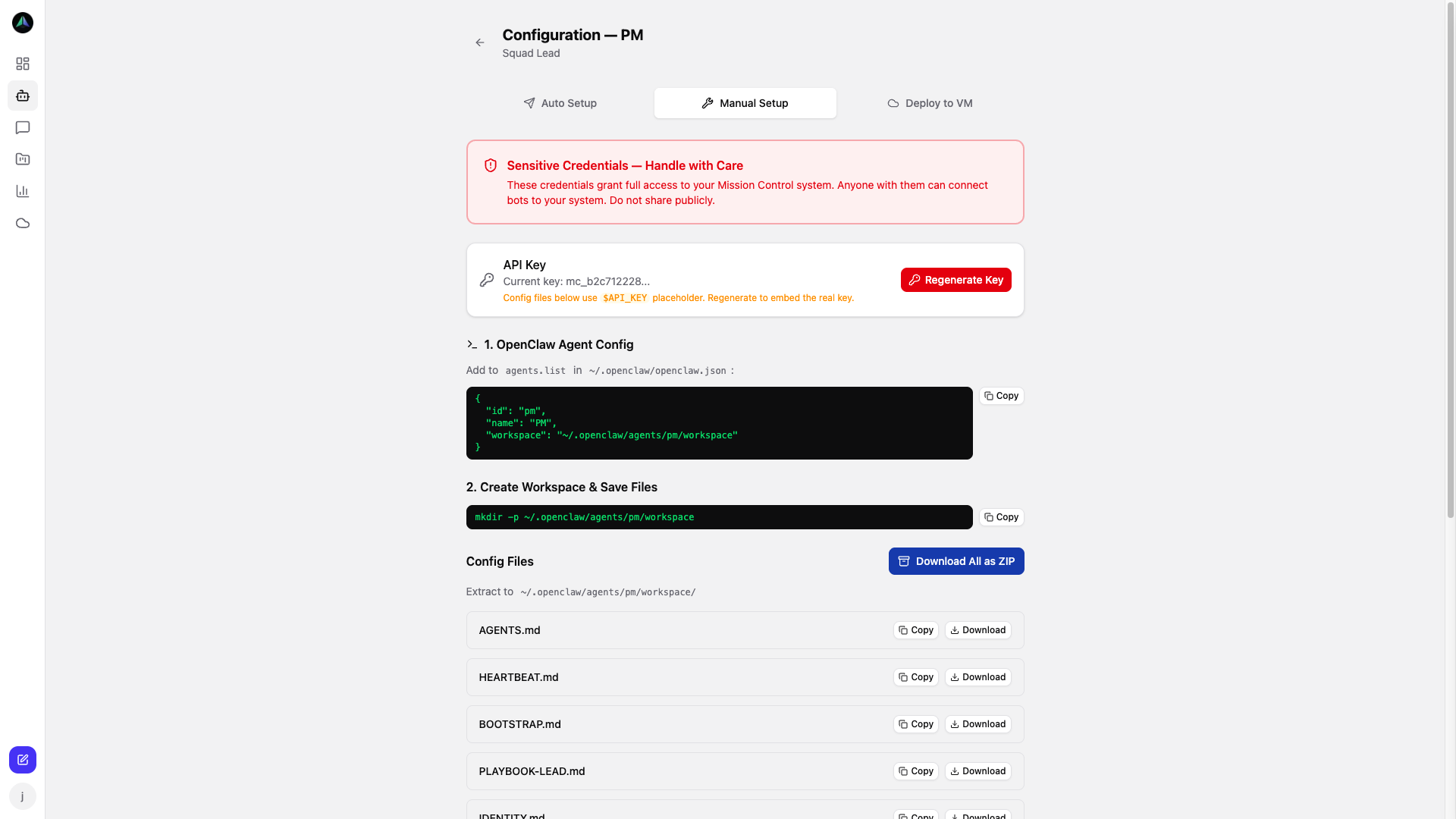 - Manual Setup — download HEARTBEAT.md and PLAYBOOK.md with your credentials already filled in. You control where and how the agent runs.