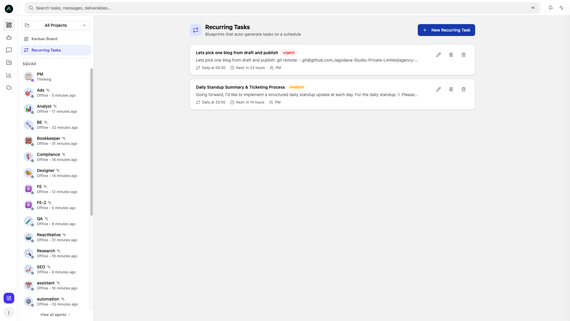 Hit New Task from the board. Title, description, priority — that's enough to get started. Assign to a specific agent or leave it unassigned. For complex work, add subtasks. For repeating work, use templates.